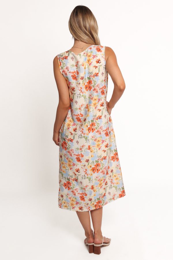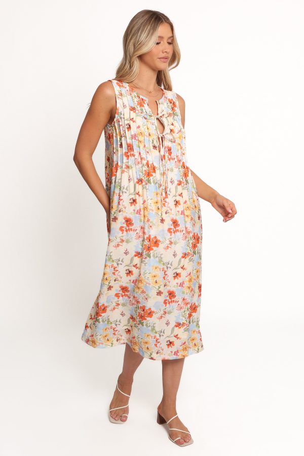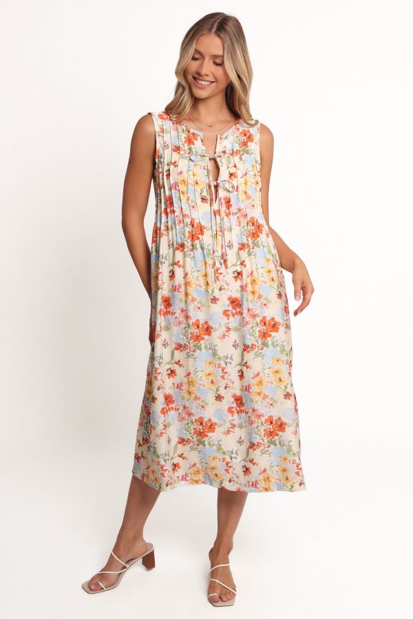 Featuring a relaxed fit and a midi length. this dress is as comfortable as it is chic. The v-neckline with a delicate tie-close detail adds just the right touch of sophistication. while the soft pleated accents create a flowing silhouette that moves with you.