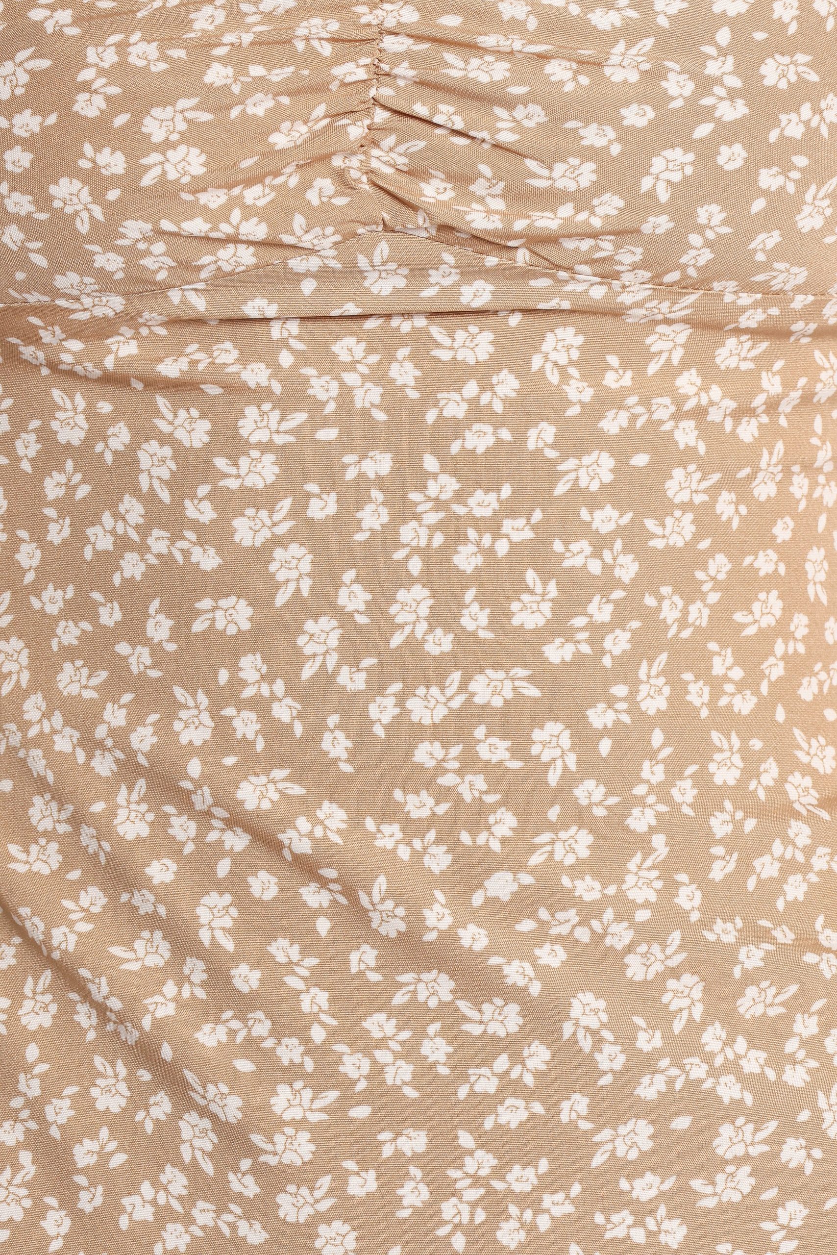 Its flowing maxi length creates an effortlessly chic silhouette perfect for any occasion. while the short sleeves with elasticized cuffs add a delicate. comfortable touch. The sweetheart neckline and ruched bust detailing bring a sense of timeless romance to your look. complemented by a subtle floral print that adds a softening of hint of femininity.