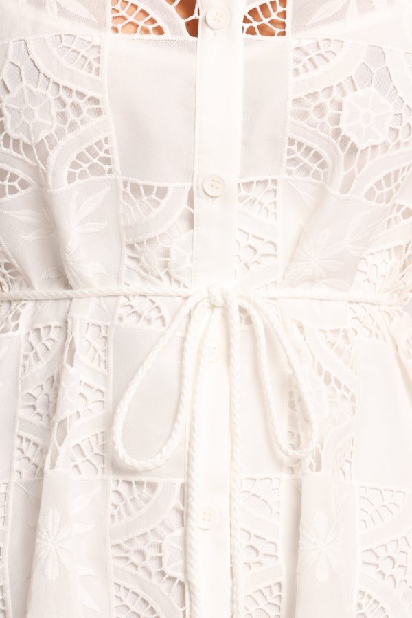 Featuring a polished collared neckline and functional button-down front. this mini-length dress strikes the perfect balance between casual and elevated. Short sleeves and an intricate embroidered design add a touch of detail that sets this piece apart.